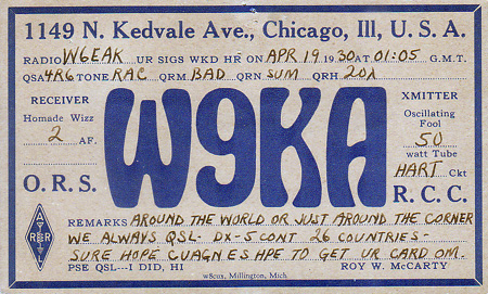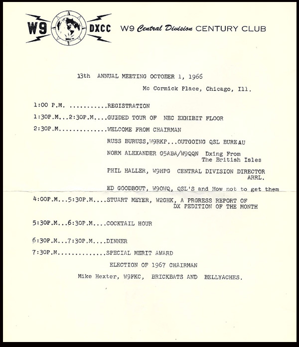 The first W9DXCC meeting was held December 5, 1953 at the Sheraton Hotel in downtown Chicago. This gathering was organized by Bob Baird (W9NN), and assisted by Roy McCarty (W9KA) and Bob Carlson (W9PGW).